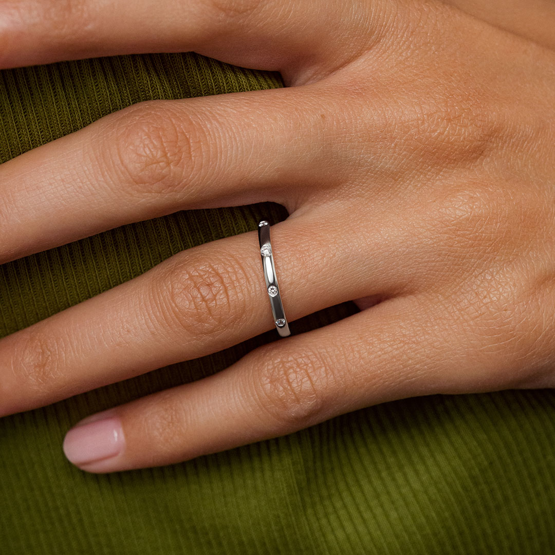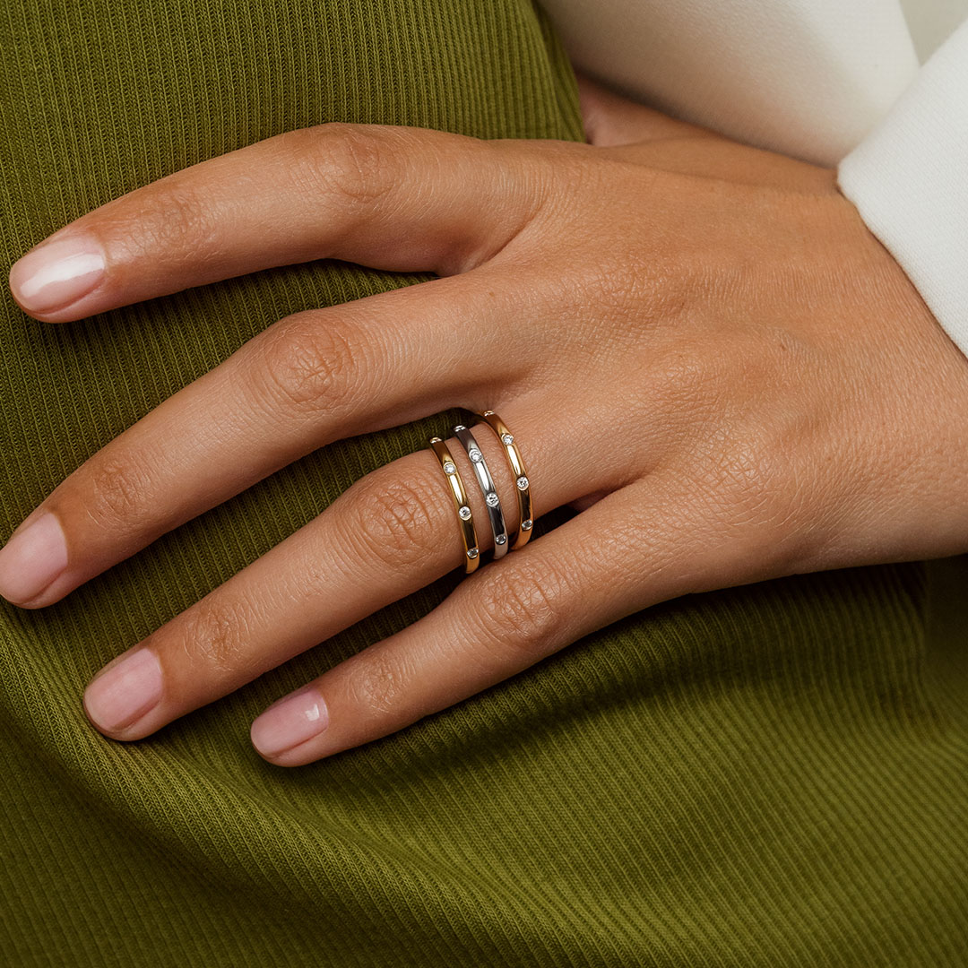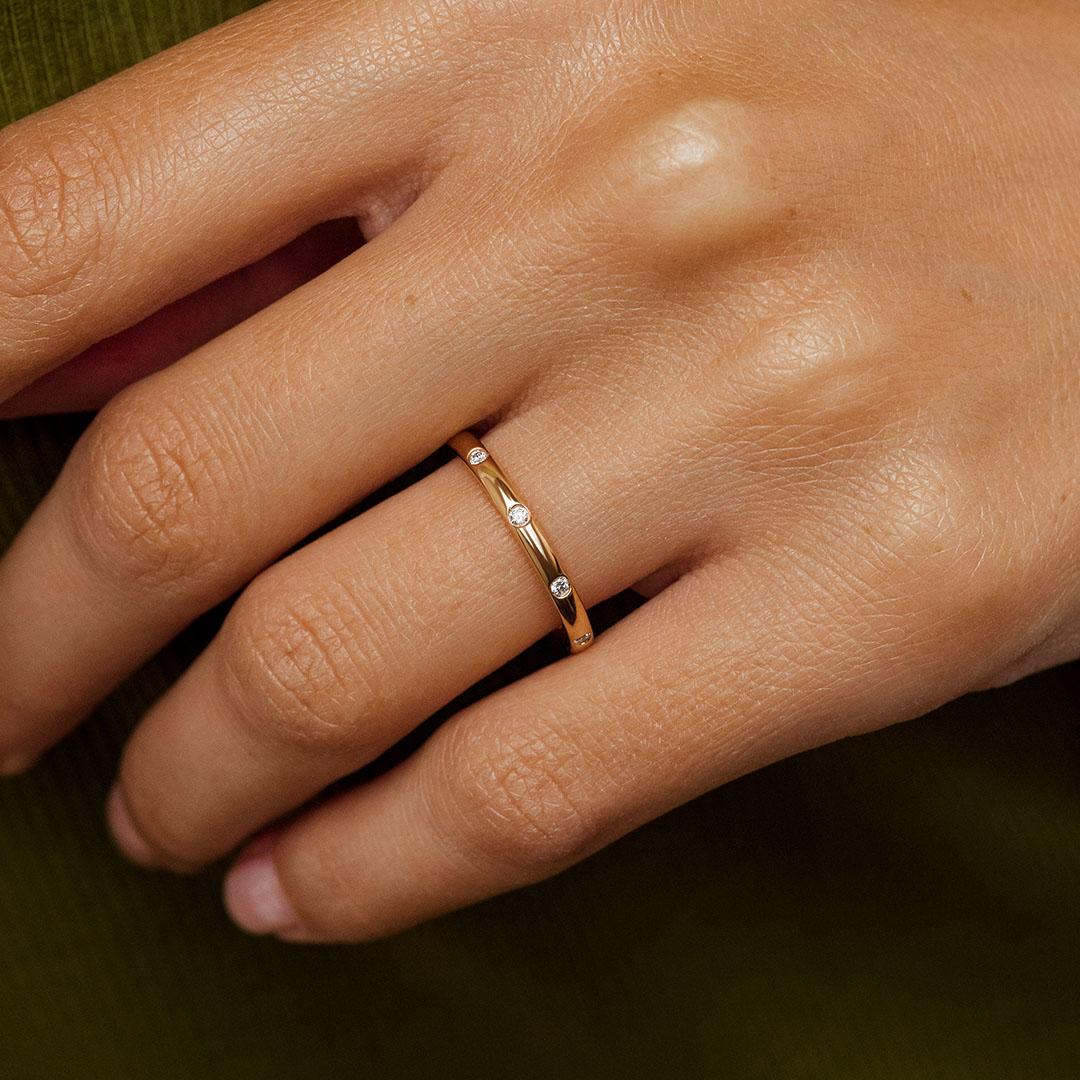 La technique du serti clos, exécutée avec une habileté artisanale, est sélectionnée pour sublimer les diamants naturels de l'Alliance Discrète. Façonnée avec minutie cette Alliance en Or 18k illustre un intemporel de la Joaillerie.