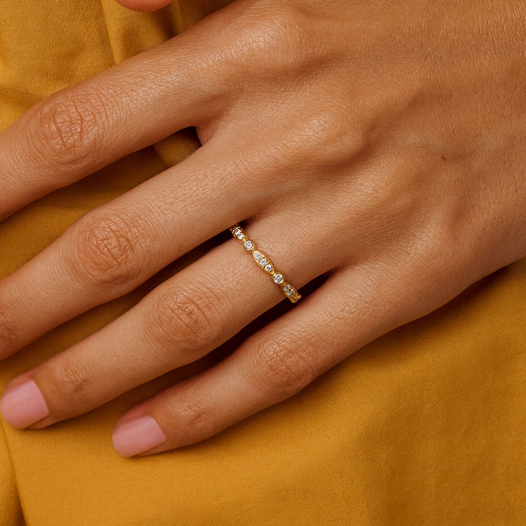 Pour la conception de l'Alliance Marquise, des diamants taille Brillants forment une ligne scintillante sur une monture en Or 18k. Un résultat unique réalisé à partir d'un serti cornière utilisé pour un effet aérien.