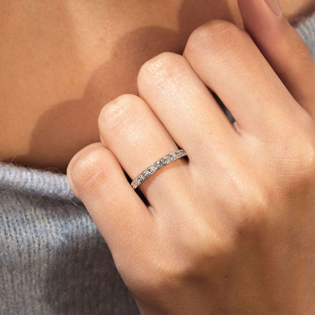 L'Alliance Pure diamantée 2.2mm, l'intemporelle par excellence, est ornée de diamants en serti grain pour un design durable et parfaitement adapté en termes de largeur et de finitions à la bague de fiançailles associée. Ici, l'Or 18k et les diamants naturels G/H SI2 sont mis en avant par un savoir-faire joaillier d'excellence.