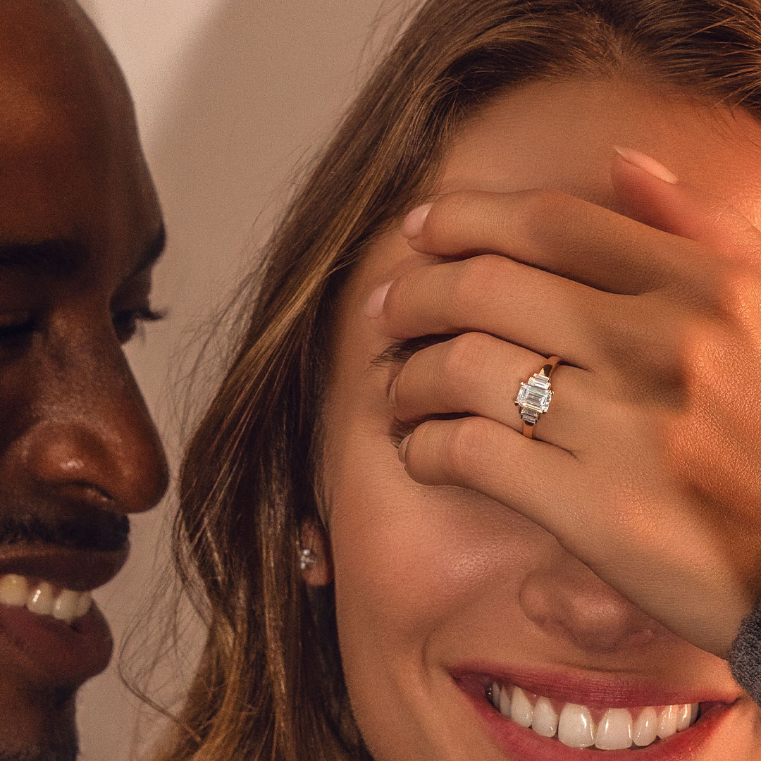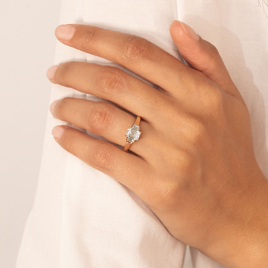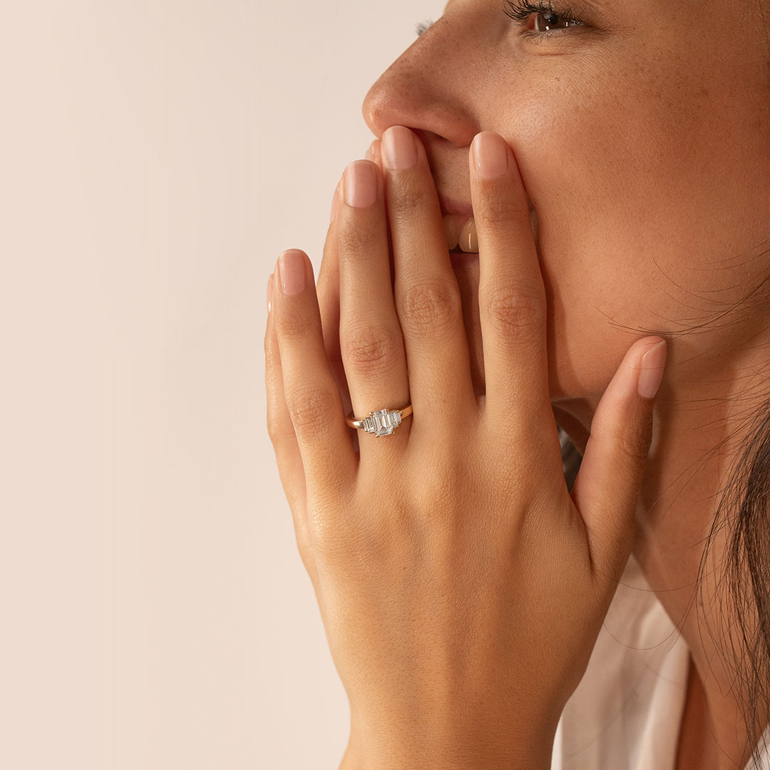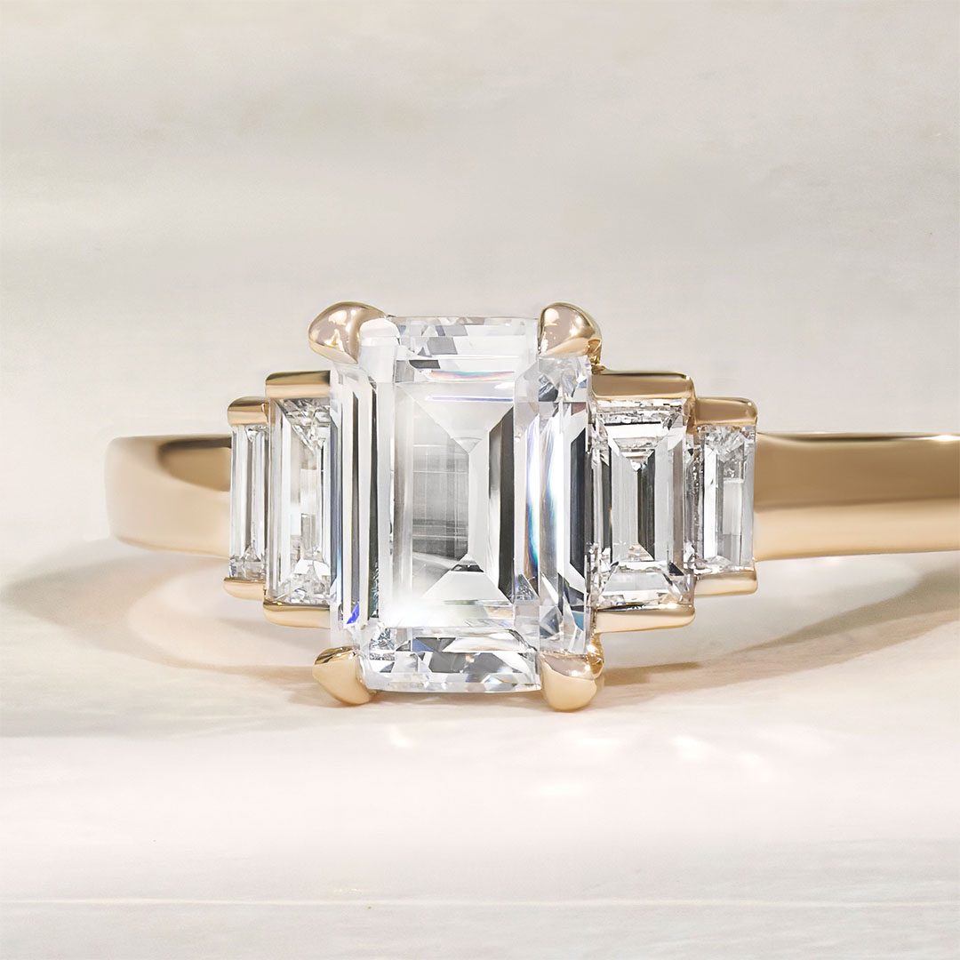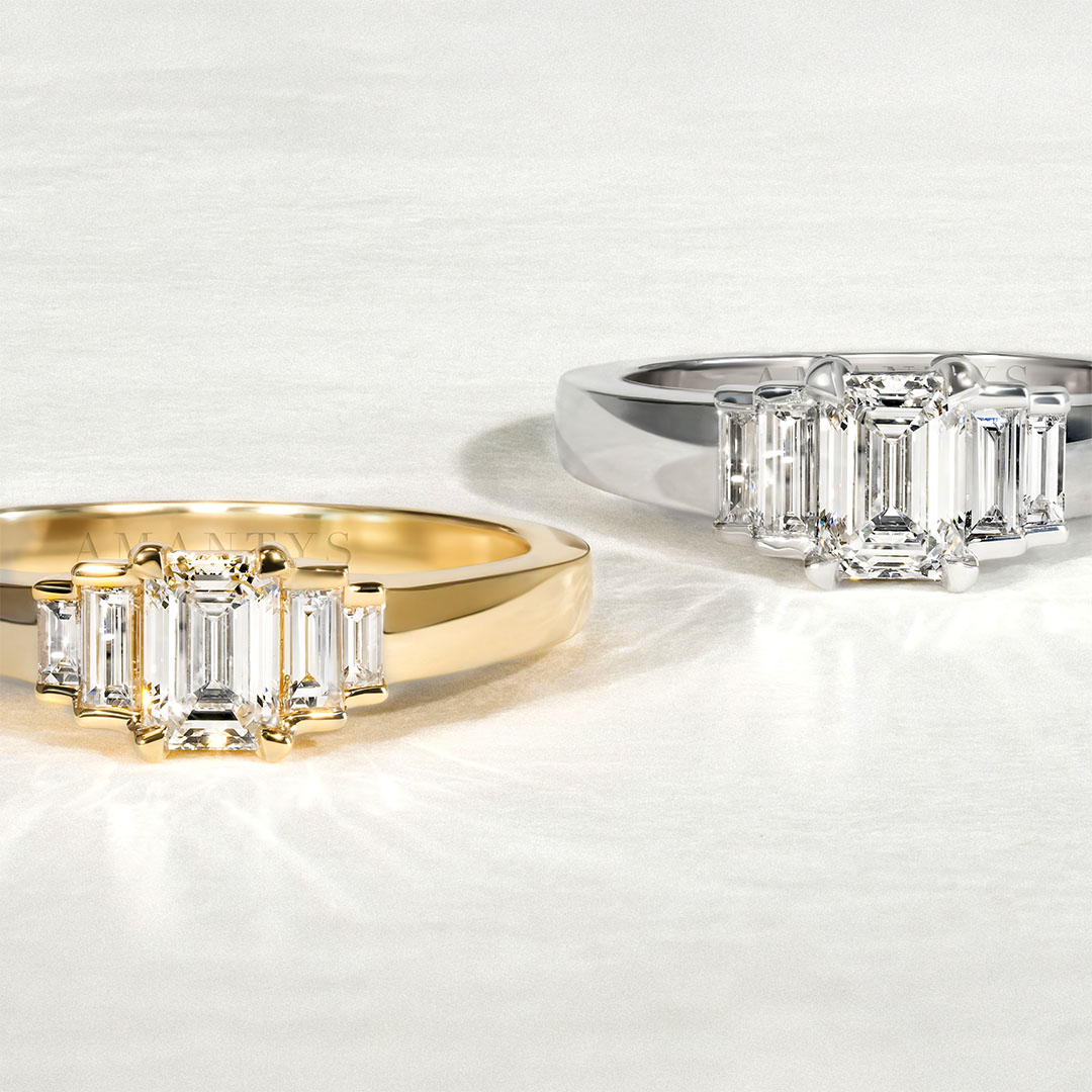 Inspiré du mouvement d’Art Déco, découvrez un modèle graphique, intemporel à l’allure audacieuse. Cette bague est composée de diamants baguettes, disposés en escaliers symétriques pour sublimer le diamant central en taille émeraude.