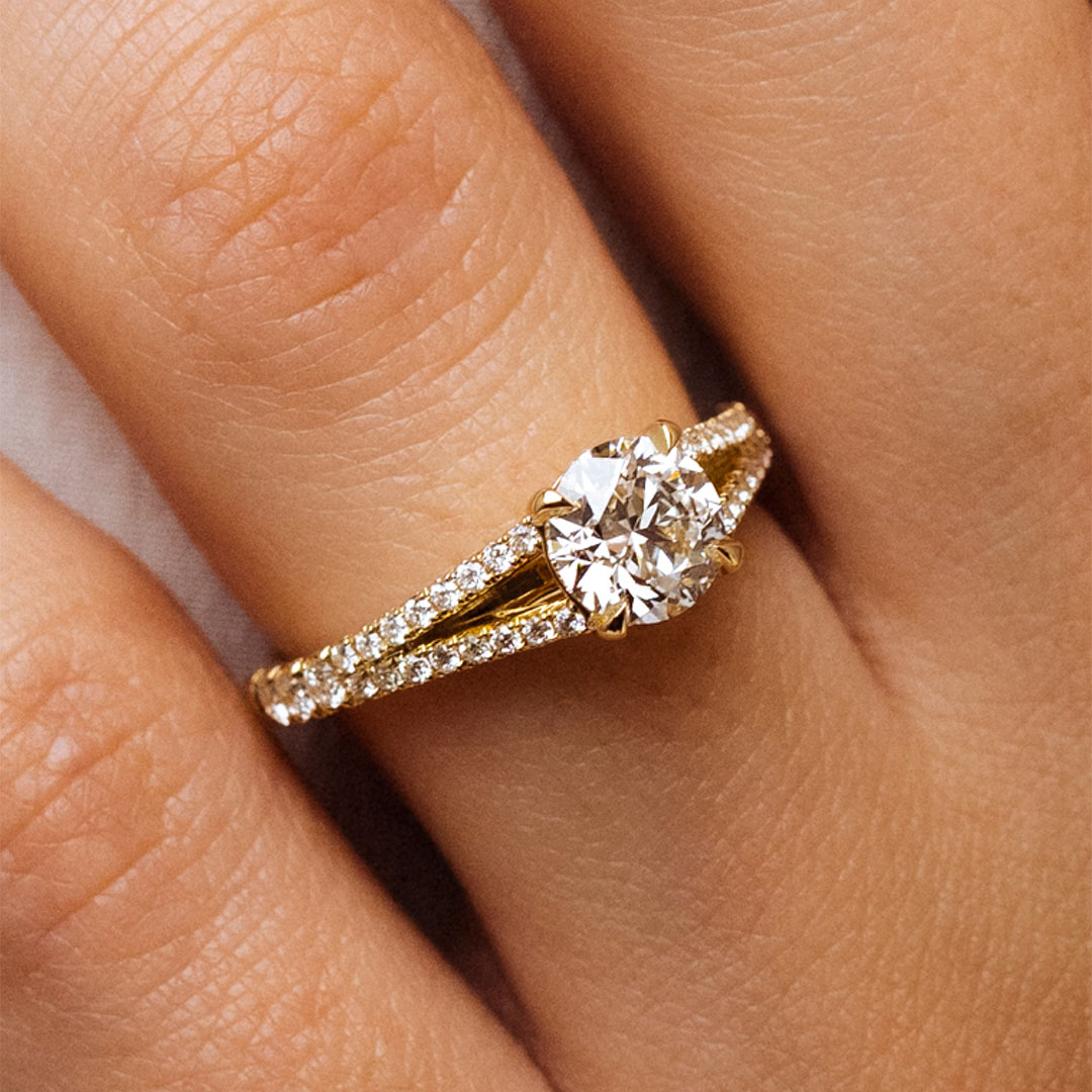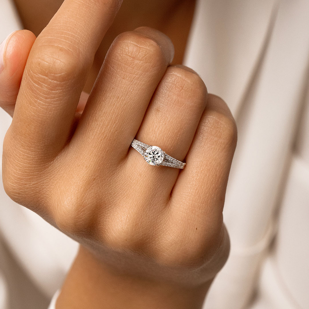 La bague de fiançailles en Or et diamants Élégante se caractérise par une monture unique sertie de diamants naturels. Il se divise et laisse deviner la peau, tout en subtilité. Un modèle à la fois classique et original façonné dans la tradition de la Joaillerie française.