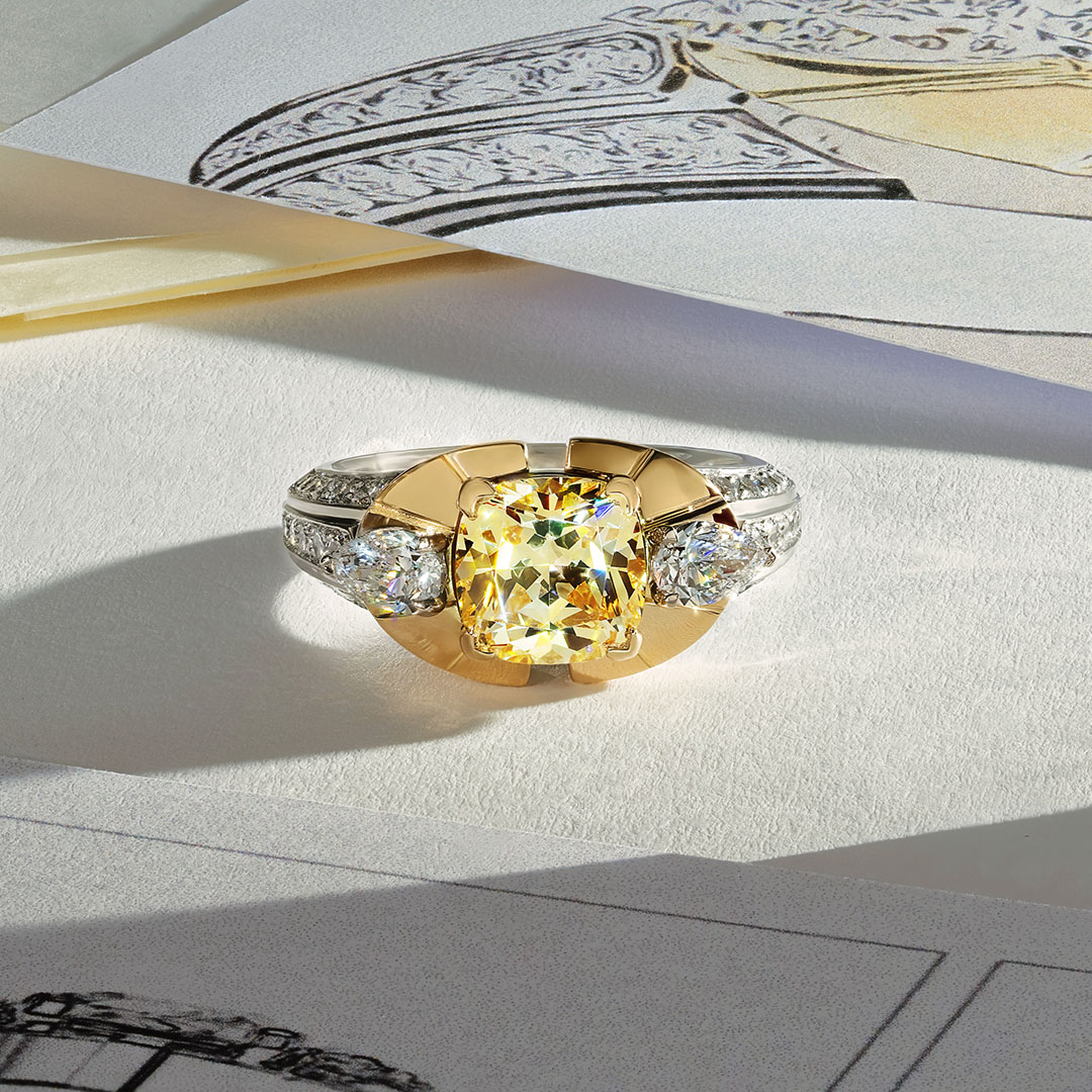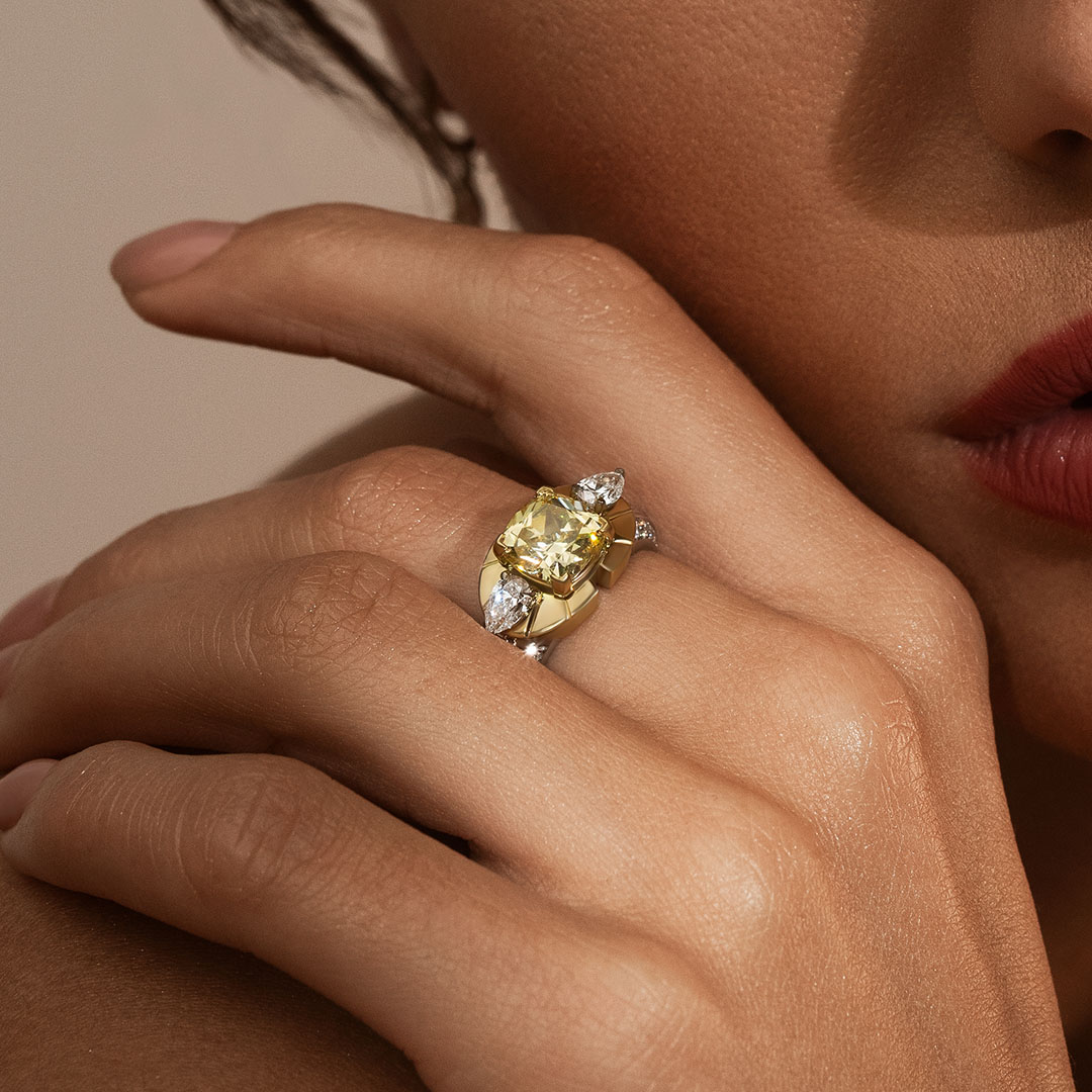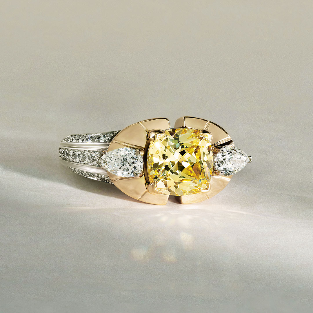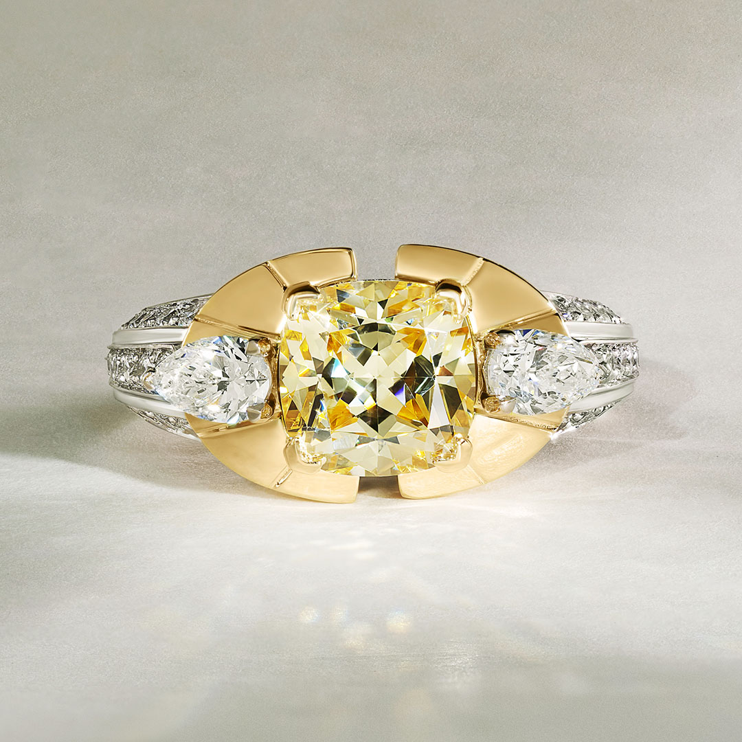 Sublimez votre main avec cette œuvre d'art joaillière, une bague unique alliant éclat et élégance. Au centre, un somptueux diamant Fancy Yellow taille Coussin 3.00 Carats st serti dans une monture en Or Jaune, magnifiant la chaleur et l'éclat de cette pierre rare. De part et d'autre, deux diamants taille Poire accentuent la symétrie de la bague, apportant un contraste lumineux et une harmonie parfaite. Le pavage délicat de diamants sur les côtés ajoute une touche de sophistication supplémentaire, rendant cette pièce encore plus précieuse.