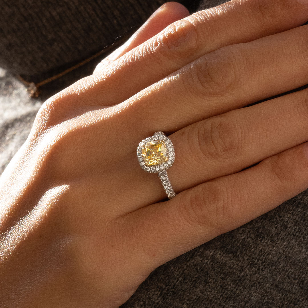 Cette bague entièrement pavée de diamants est une version revisitée de notre modèle iconique : la Délicate. Ici, nos Gemmologues ont sélectionné un diamant naturel jaune taille Coussin 2.50 Carats SI1. Le corps de bague ainsi que le chaton ont été sertis de diamants taille brillant pour un scintillement inégalable.
