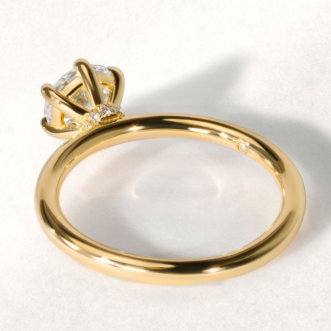 Ce somptueux Solitaire en Or 18K est orné d'un diamant taille brillant de 0.50 Carat G/H SI2, minutieusement maintenu par six griffes. Conçue sur-mesure et réalisée à la main dans notre Atelier, cette bague de fiançailles se distingue par une délicate ceinture diamantée, à admirer de profil. Un chef-d'œuvre intemporel, symbole d'amour et de sophistication.