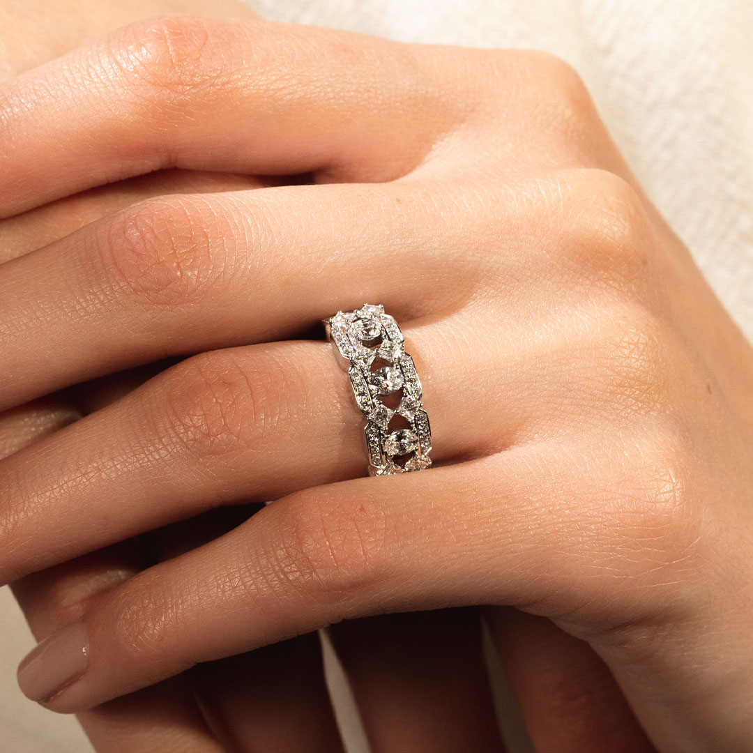La bague en diamants Rationnelle met en lumière la diversité des formes de pierre. Alternant des diamants de taille ovale, brillant, et princesse, son style est résolument géométrique.