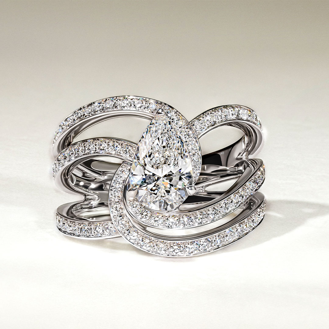 La bague en diamants Volute se distingue par ses courbes généreuses qui se rejoignent autour d'un diamant central Taille Poire de 1.00 Carat de qualité F/G SI1 serti par quatre griffes. Elle se déploie sur le doigt pour dessiner une création Haute Joaillerie.