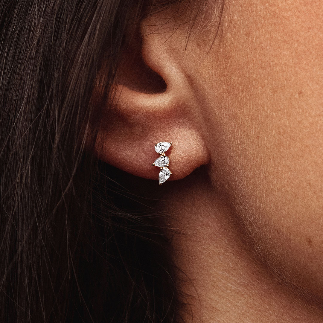 La paire de boucles d'oreilles Audacieuses est une trilogie de diamants de taille Poire aussi créative qu’élégante. Une ligne délicatement déstructurée sublime vos oreilles pour un effet romantique.