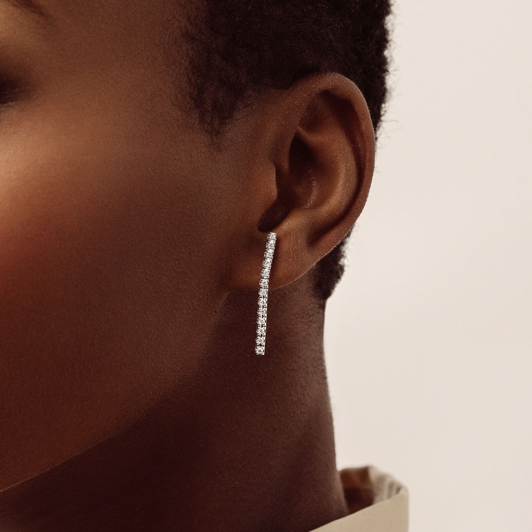 La paire de boucles d'oreilles Rivière est une interprétation contemporaine d'un grand classique de la haute joaillerie. Une ligne de diamants taille brillant, sertis sur une monture souple, épouse chacun de vos mouvements.