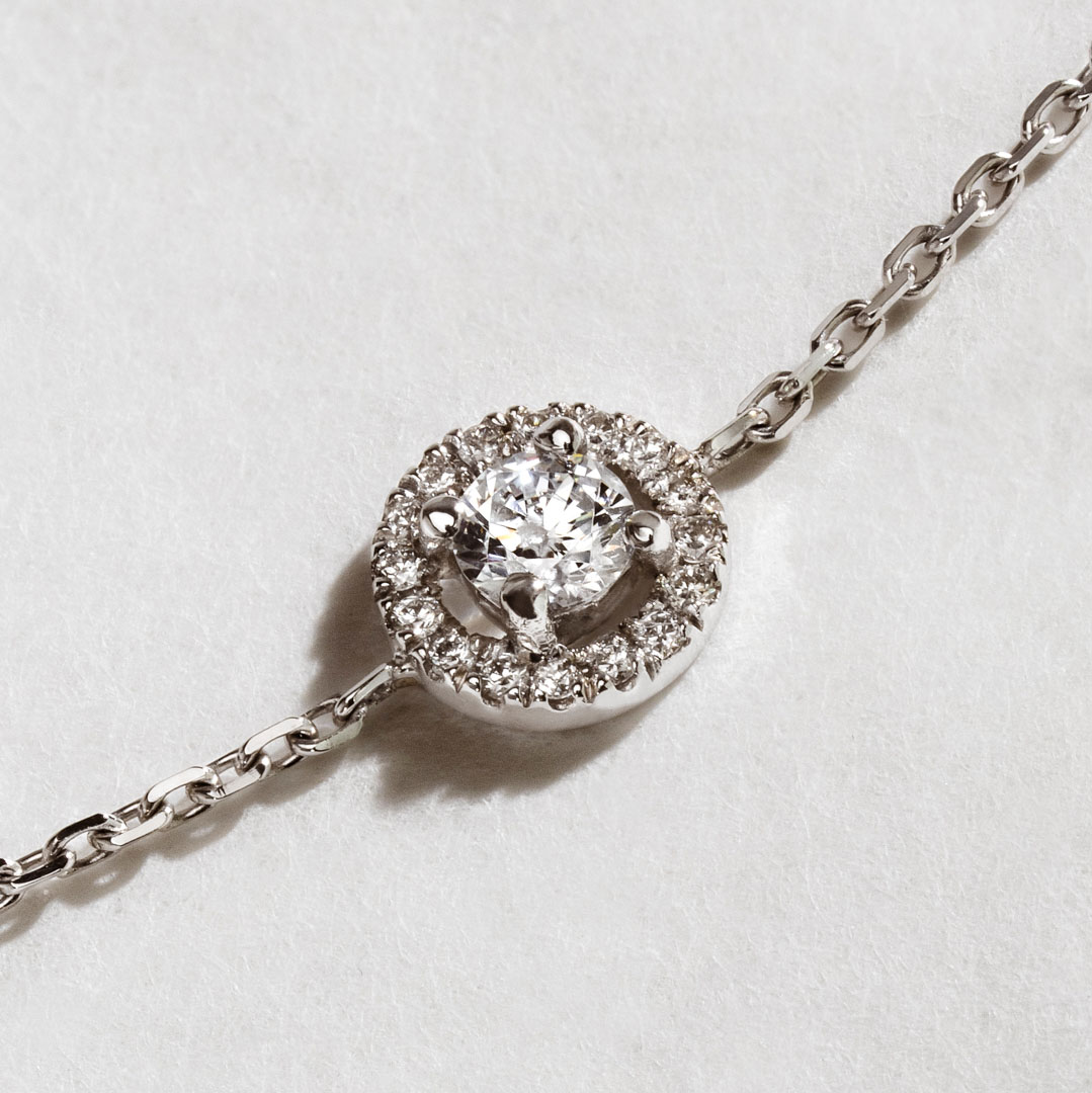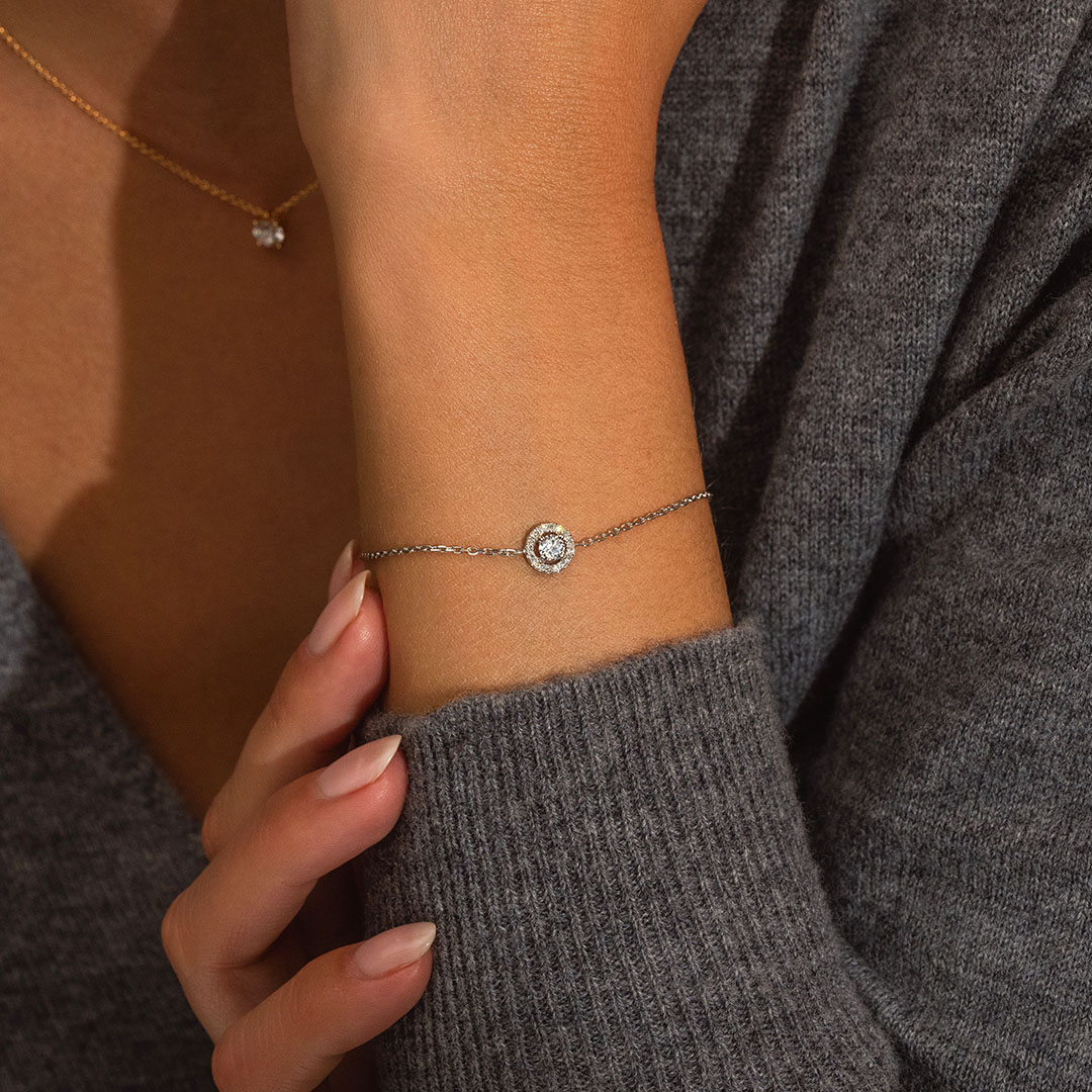 Le Bracelet Délicat est la déclinaison joaillière de la bague de fiançailles iconique du même nom. Comme l’incontournable de la Maison, le diamant central en G/H SI2 de cette création est entouré d’un Halo scintillant. La technique joaillière du micro-serti donne un aspect aérien à l’ensemble pour un rendu intemporel et élégant.