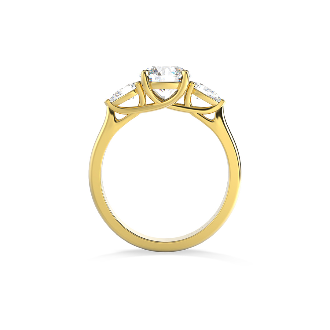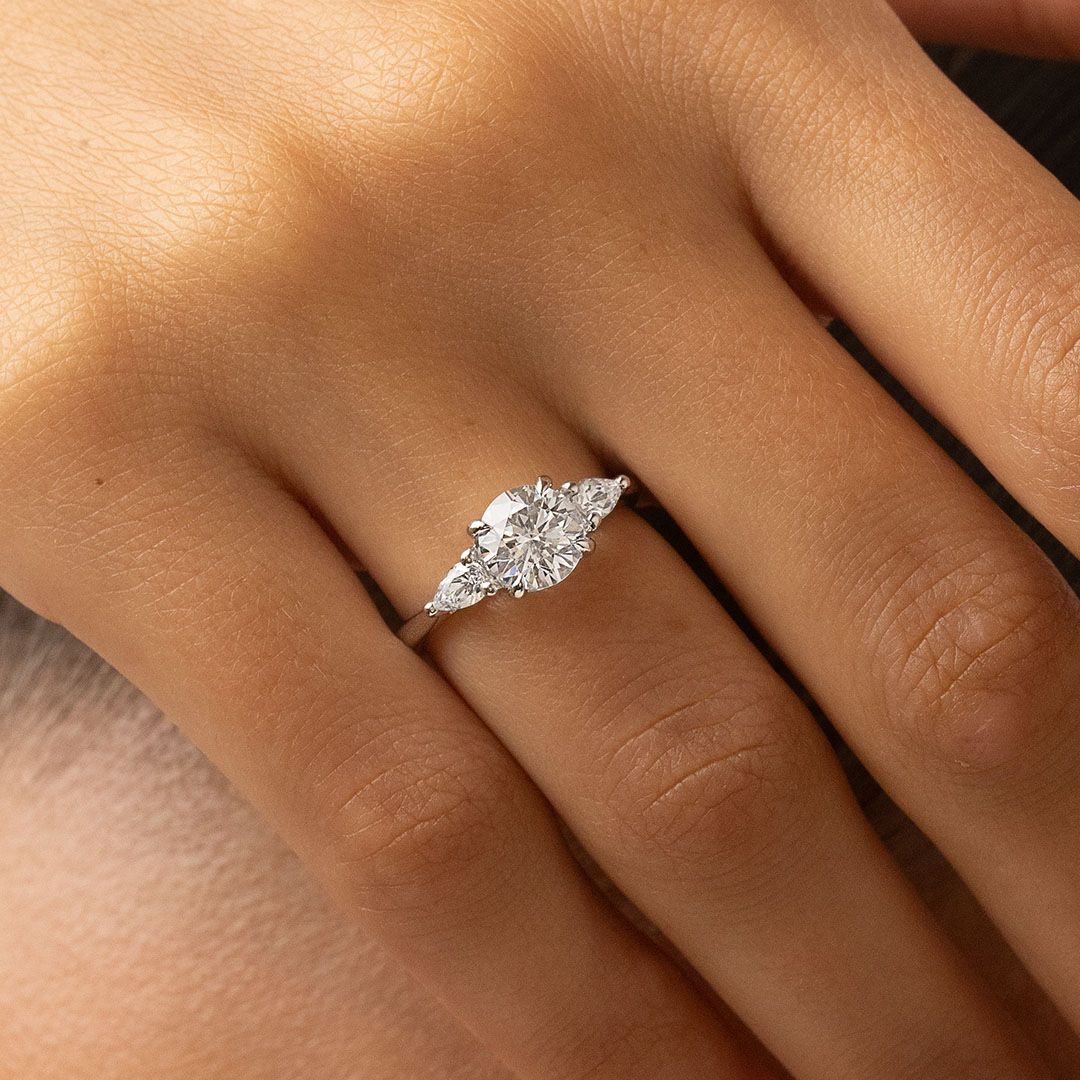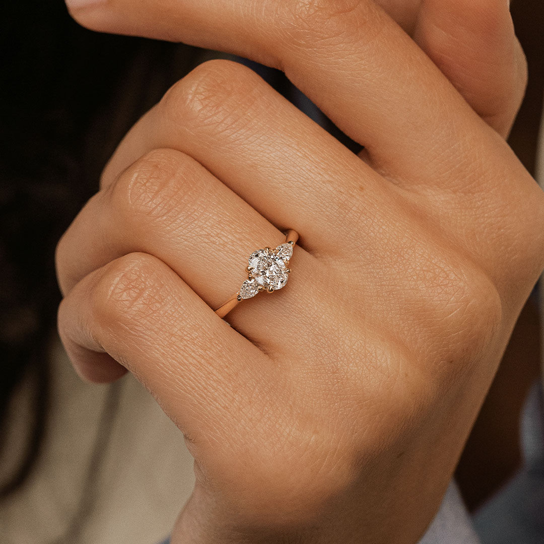 La bague de fiançailles Inséparable allie intemporalité et singularité. La pierre centrale est accompagnée de deux diamants taille Poire semblables à des pétales de fleur. De profil se dessine un chaton croisé qui soutient cette trilogie de diamants originale.