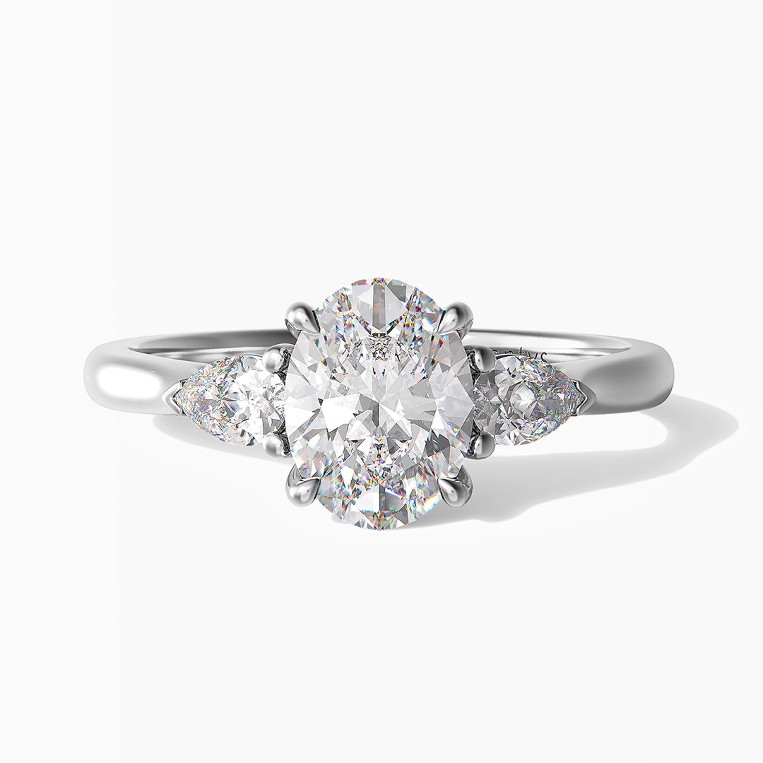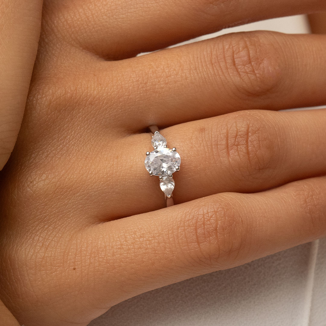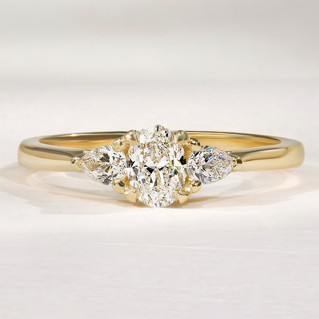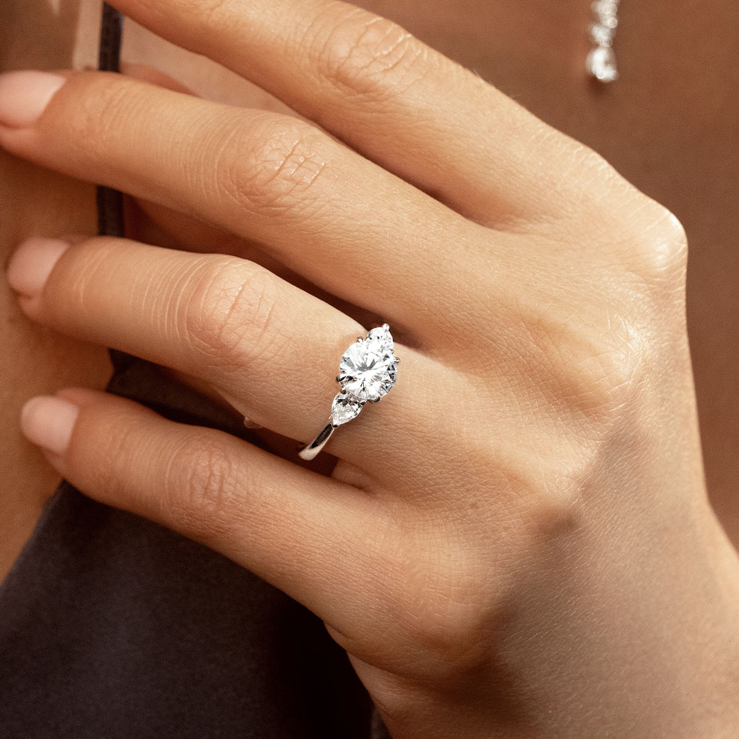 La bague de fiançailles Inséparable allie intemporalité et singularité. La pierre centrale est accompagnée de deux diamants taille Poire semblables à des pétales de fleur. De profil se dessine un chaton croisé qui soutient cette trilogie de diamants originale.
